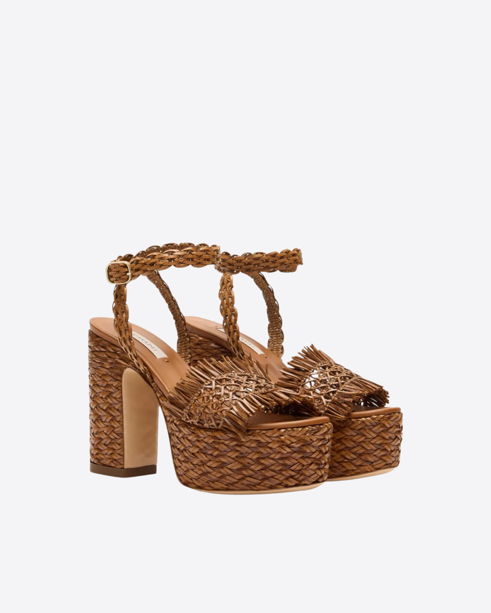 Sandalo platform open toe Casadei in raffinata tonalità havana brown, caratterizzato da una sofisticata struttura intrecciata e chiusura con fibbia.
