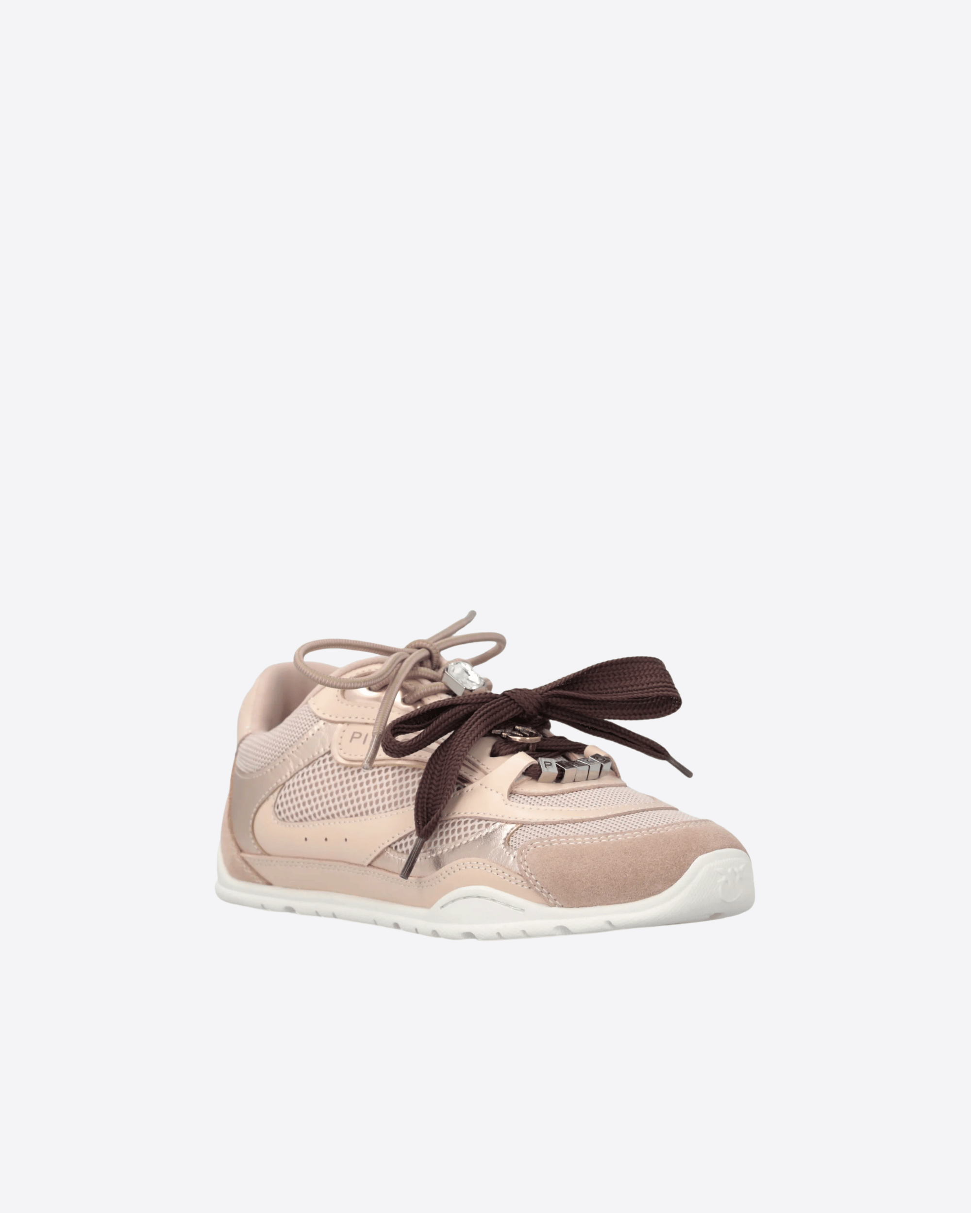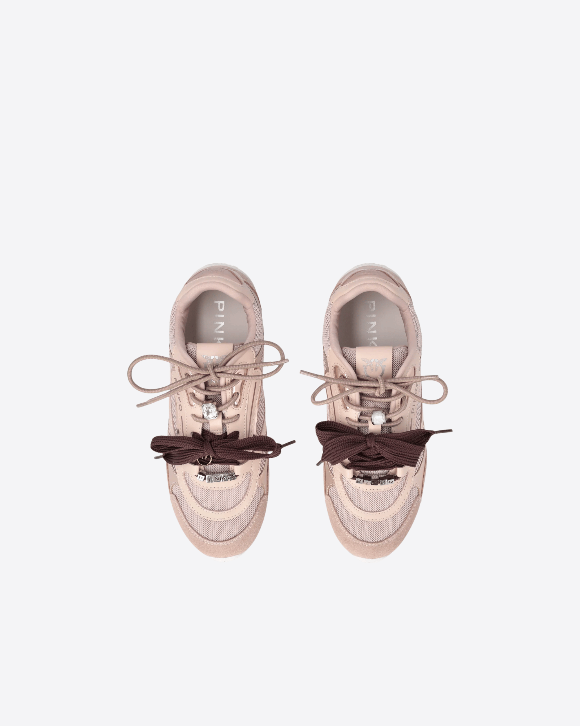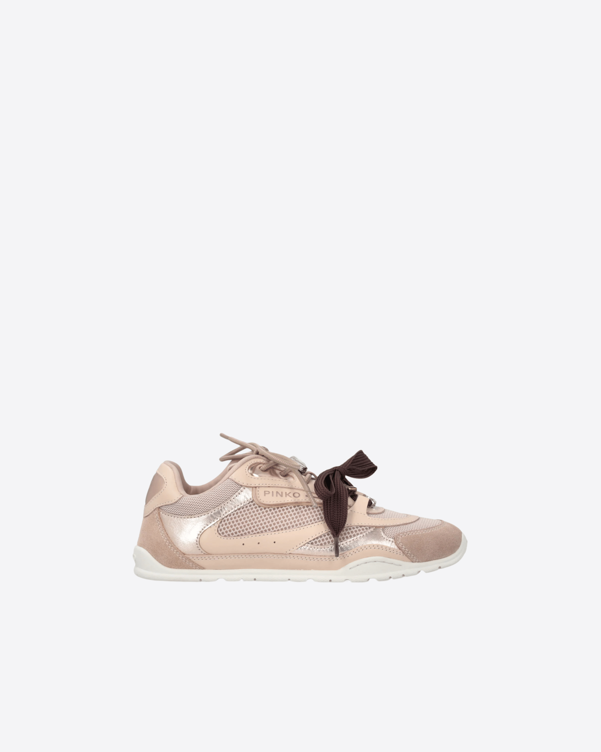 Scarpa da ginnastica caratterizzata da un originale gioco di contrasti, con accostamenti di mesh, inserti in pelle opaca e specchiata e dettagli in suede, completata da doppi lacci di forme e colori diversi. Il logo con gli iconici uccellini Love Birds spicca sulla linguetta, sul tallone e come applicazione metallica dorata sui lacci, accompagnato da anelli metallici che formano il lettering Pinko. I lacci superiori con dettagli grafici sono arricchiti da un brillante gioiello incastonato su una scarpa e da un charm effetto marmorizzato sull’altra. L’interno è dotato di fussbett da 10 mm in latex per un’ammortizzazione ottimale, mentre la suola in gomma garantisce grip e comfort. Una rivisitazione contemporanea della sneaker sportiva, reinterpretata in chiave Pinko per distinguerti con stile anche negli outfit quotidiani.