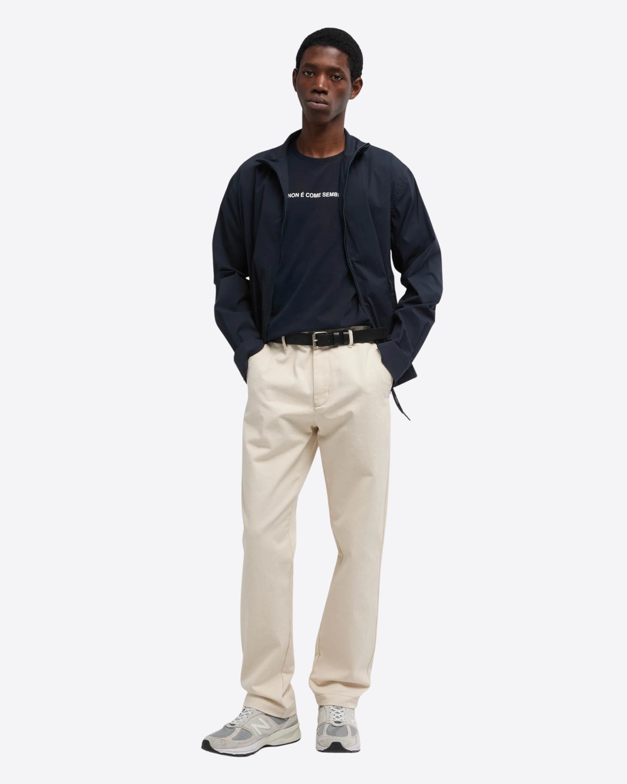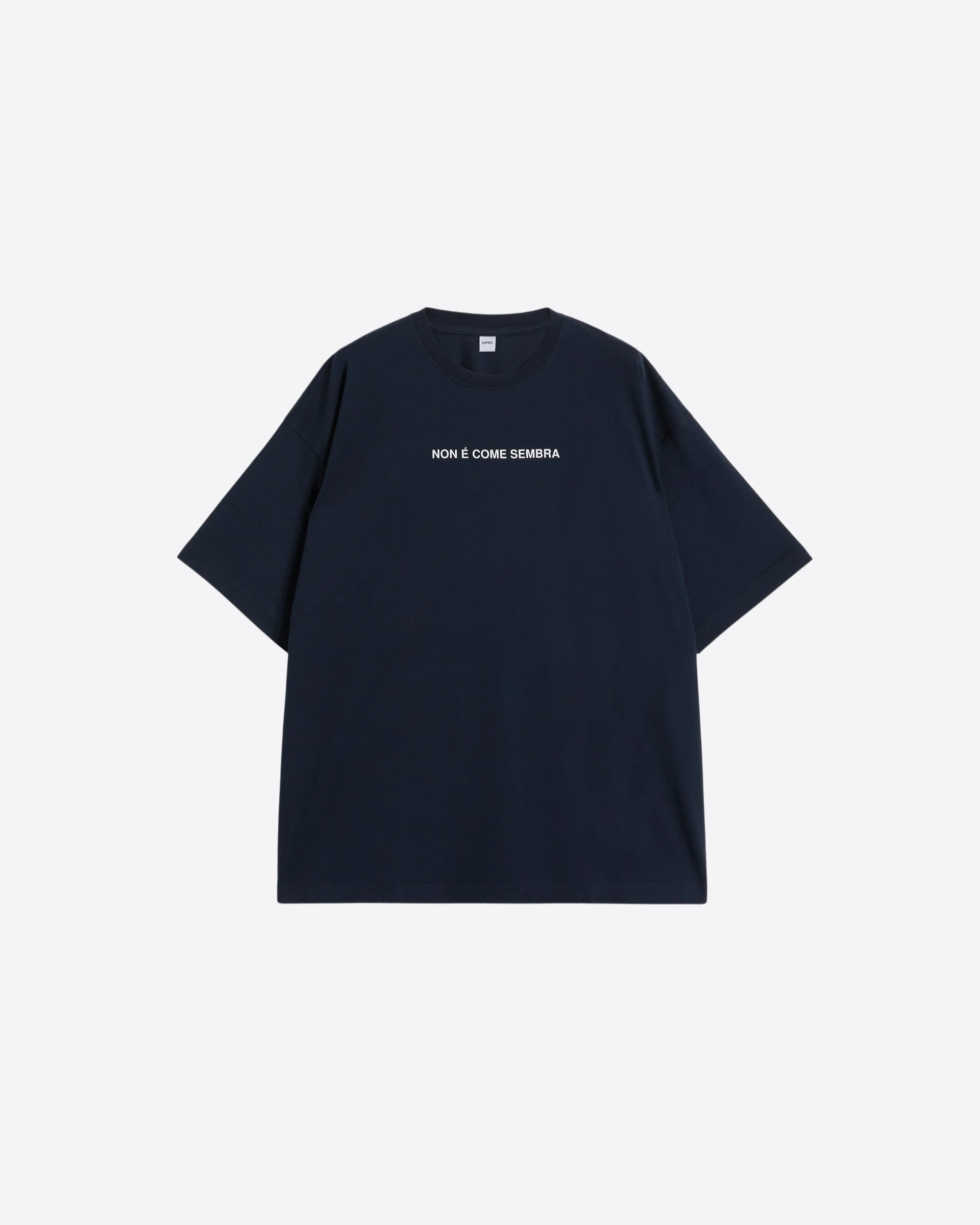 Il modello presenta la stampa “-Non è come sembra-” sul davanti, che conferisce un tocco originale e contemporaneo, mentre l’etichetta Aspesi a bandierina sul fianco aggiunge un dettaglio distintivo. La vestibilità è regolare, adatta a ogni occasione.