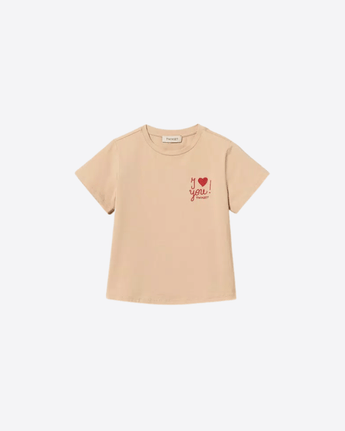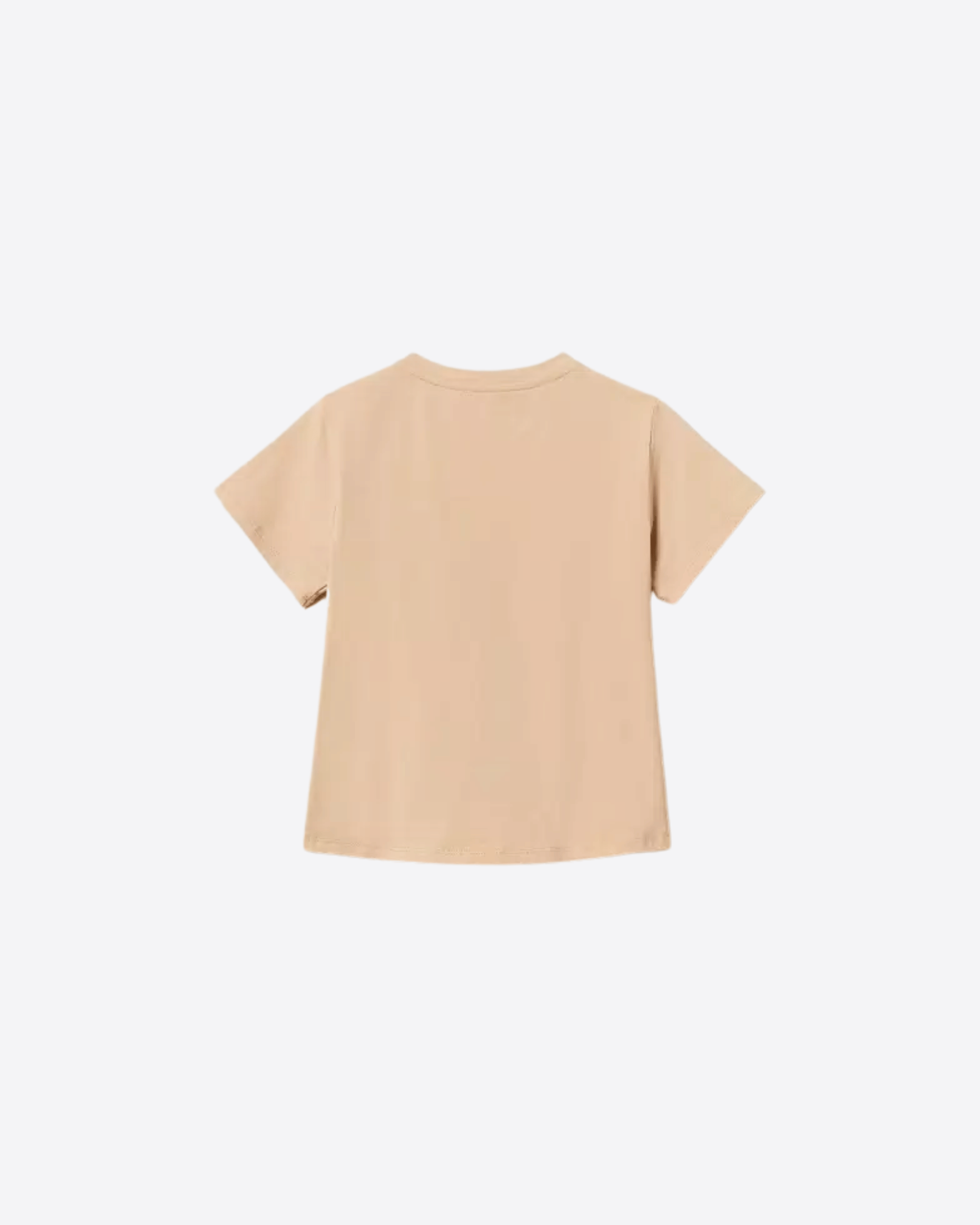 T-shirt da bambina realizzata in jersey di cotone stretch, impreziosita da ricamo a catenella in colore a contrasto. Il modello presenta collo tondo, maniche corte e una linea regular, pensata per garantire comfort e libertà di movimento nell’uso quotidiano.