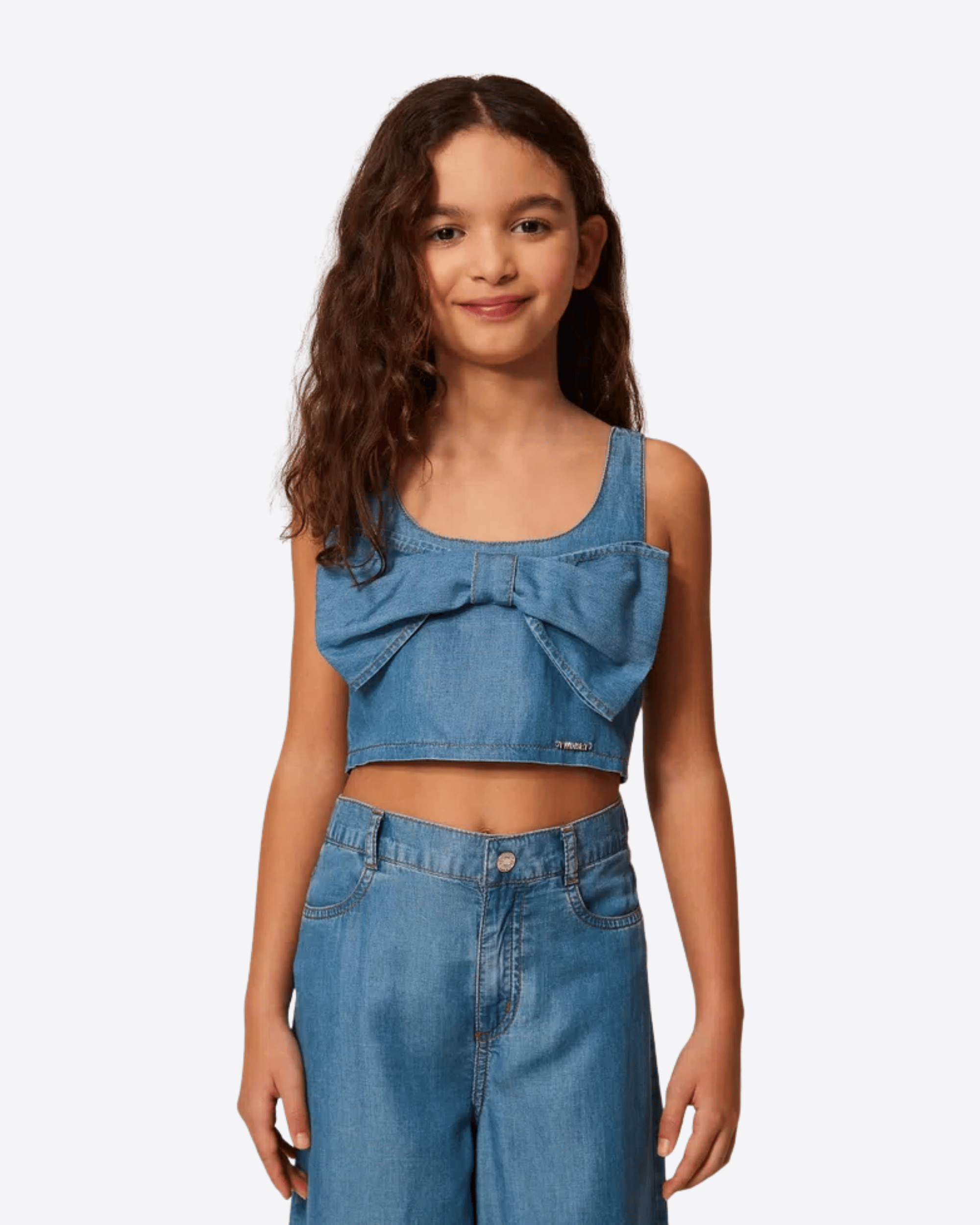 Top cropped in chambray dallo stile fresco e contemporaneo, perfetto per completare look estivi con un tocco di carattere. Il design è valorizzato dal maxi fiocco applicato sul davanti, dettaglio protagonista che dona femminilità e originalità al capo.