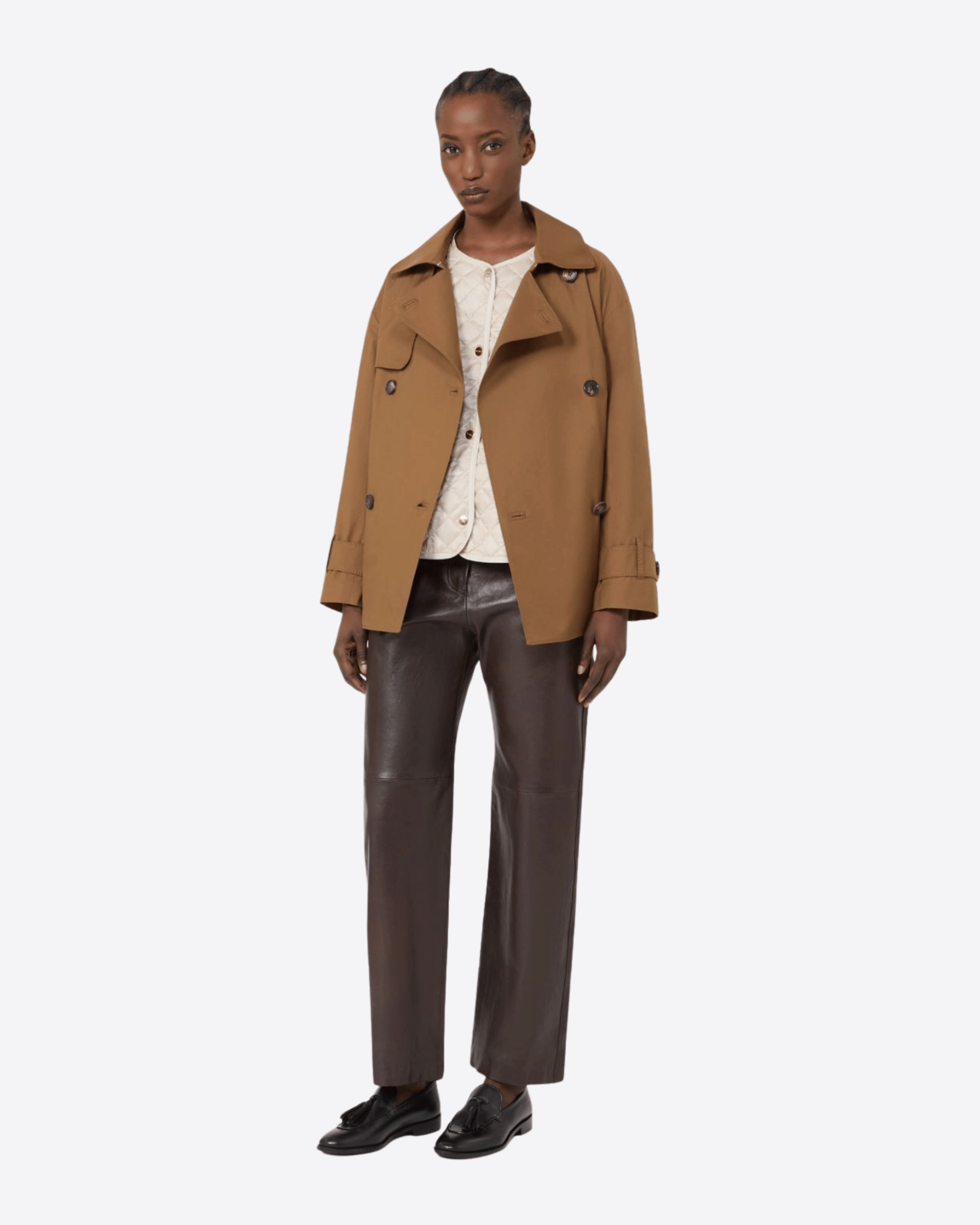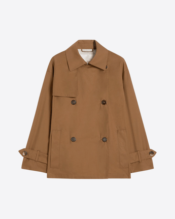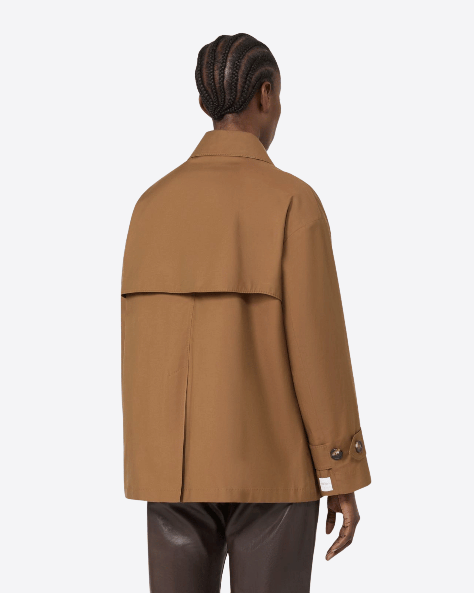 Trench corto doppiopetto dalla linea dritta, caratterizzato da colletto a camicia, mantellina sul retro e bavolet asimmetrica sul davanti, lato destro indossato. Realizzato in twill di misto cotone antigoccia, con tessuto principale contenente almeno il 50% di fibra di cotone proveniente da agricoltura biologica. Il modello presenta maniche con spalla scesa e alamari regolabili sui polsi, chiusura frontale con bottoni in corno e tasche a filetto sui fianchi. Spacco centrale sul retro e interno semifoderato in taffetà con nastro logato jacquard completano il design funzionale e raffinato.