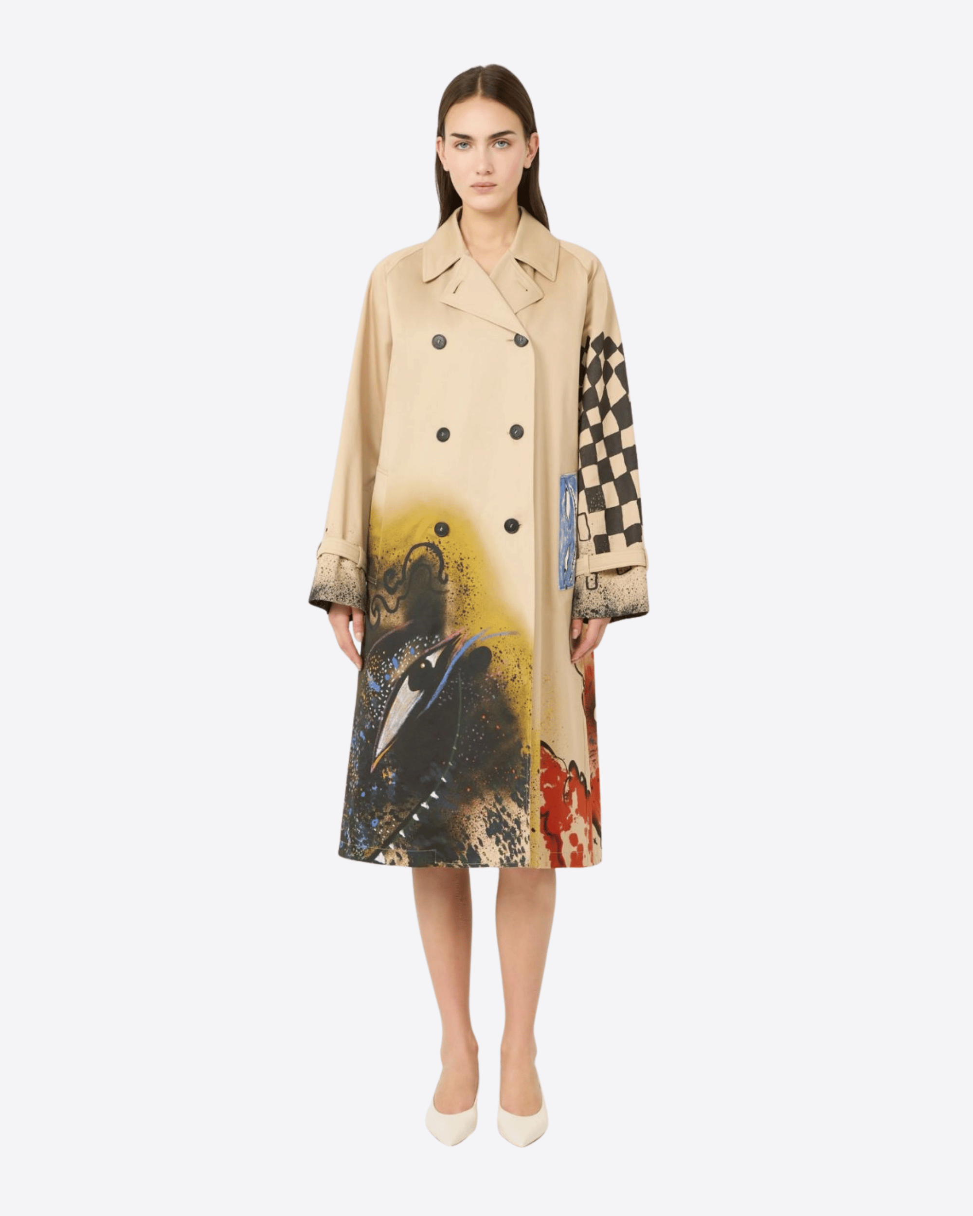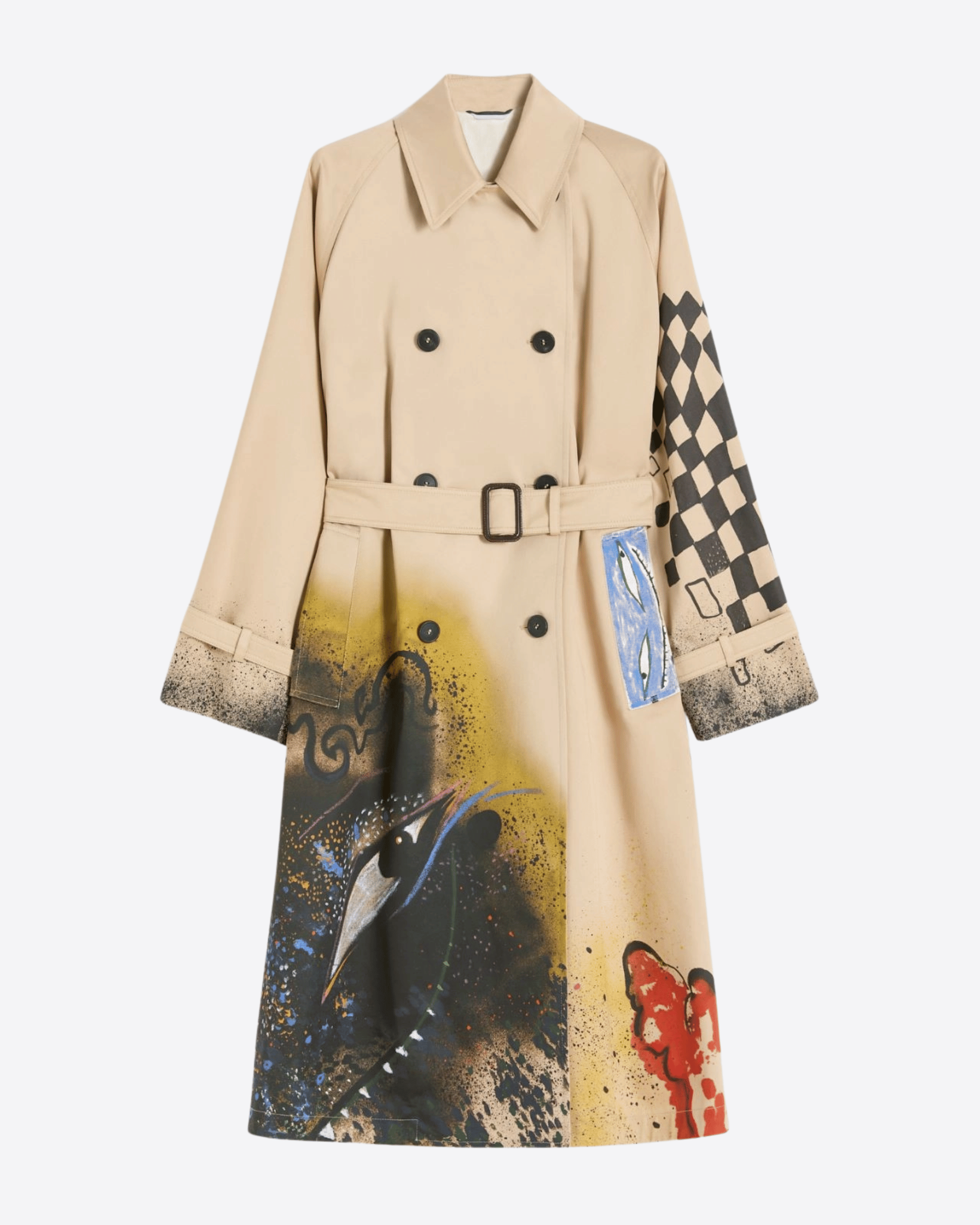 A Weekend with an Artist celebra la creatività: Victoria Kosheleva reinterpreta l’iconico trench coat di Weekend Max Mara, trasformandolo in un’opera d’arte da indossare. Realizzato in gabardina di cotone antigoccia, presenta una linea svasata con spacco centrale sul retro, colletto a camicia doppio uso e maniche lunghe raglan con alamari sui polsi. La chiusura è con bottoni e cintura abbinata con fibbia in pelle, mentre le tasche a filettone sui fianchi e la mantellina sulla schiena aggiungono praticità e carattere. Semifoderato, con logo Weekend Max Mara nella fodera interna dello sprone, unisce stile, funzionalità e un tocco artistico unico.
