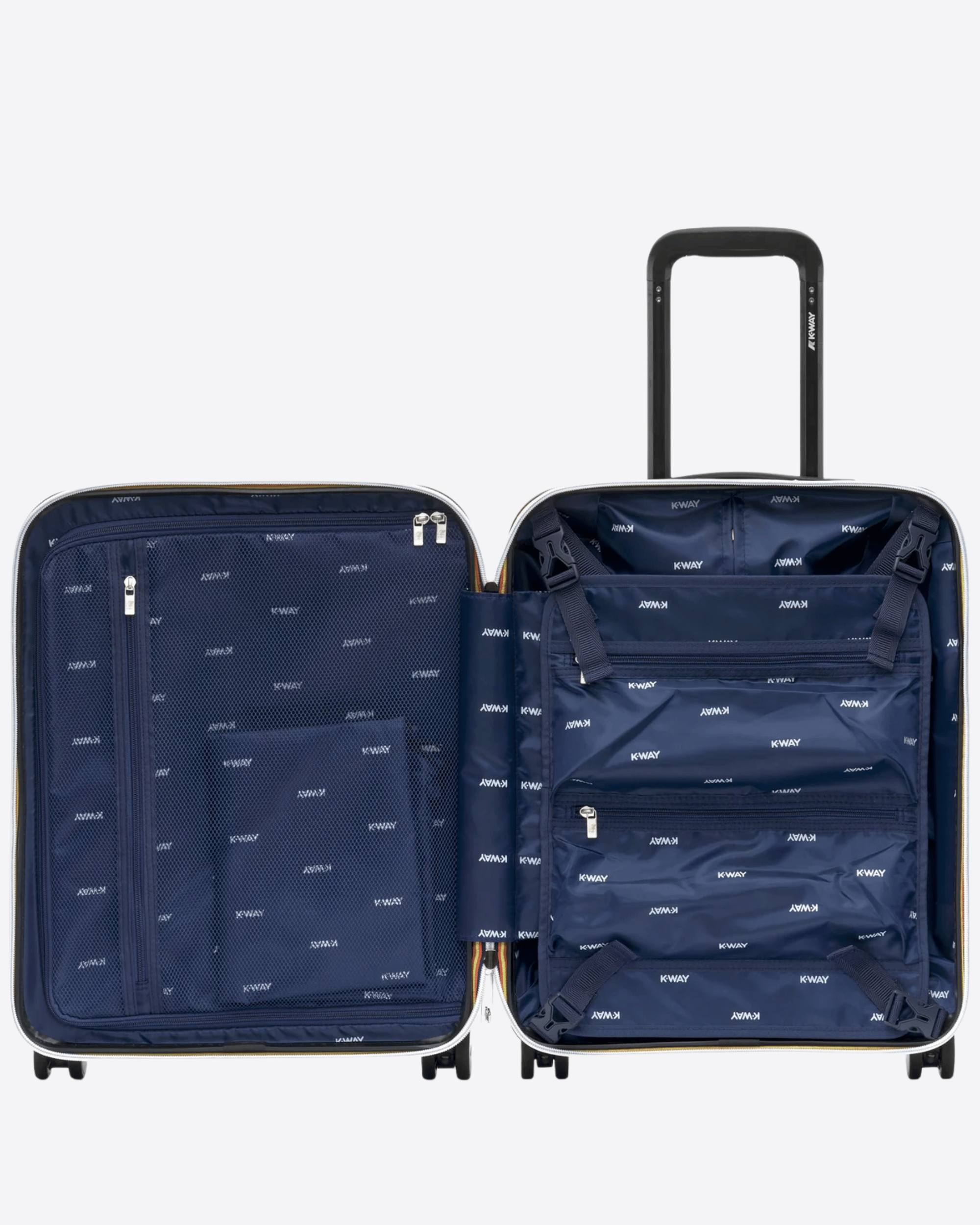 Eudoxie è un trolley rigido di piccole dimensioni firmato K-Way, ideale per brevi viaggi o come bagaglio a mano. Realizzato con guscio in policarbonato, è resistente e leggero, con fodera interna in poliestere logata all-over. L’interno è organizzato con pannello divisorio rimovibile con inserti in rete, tasca con zip e sacchetto biancheria con chiusura coulisse. Dotato di quattro ruote girevoli a 360°, maniglia estensibile in alluminio e sistema di chiusura a combinazione TSA, adatto ai controlli di sicurezza internazionali. Completo di tag per etichetta bagaglio e monogramma K-Way in rilievo tono su tono. Misure: 55x38x22 cm. Capienza: 39 L. Peso: 2,9 kg.