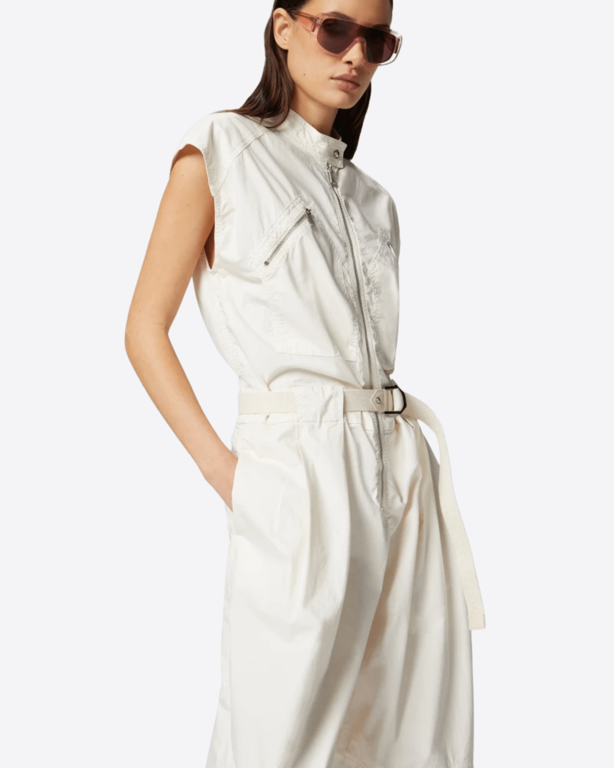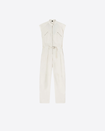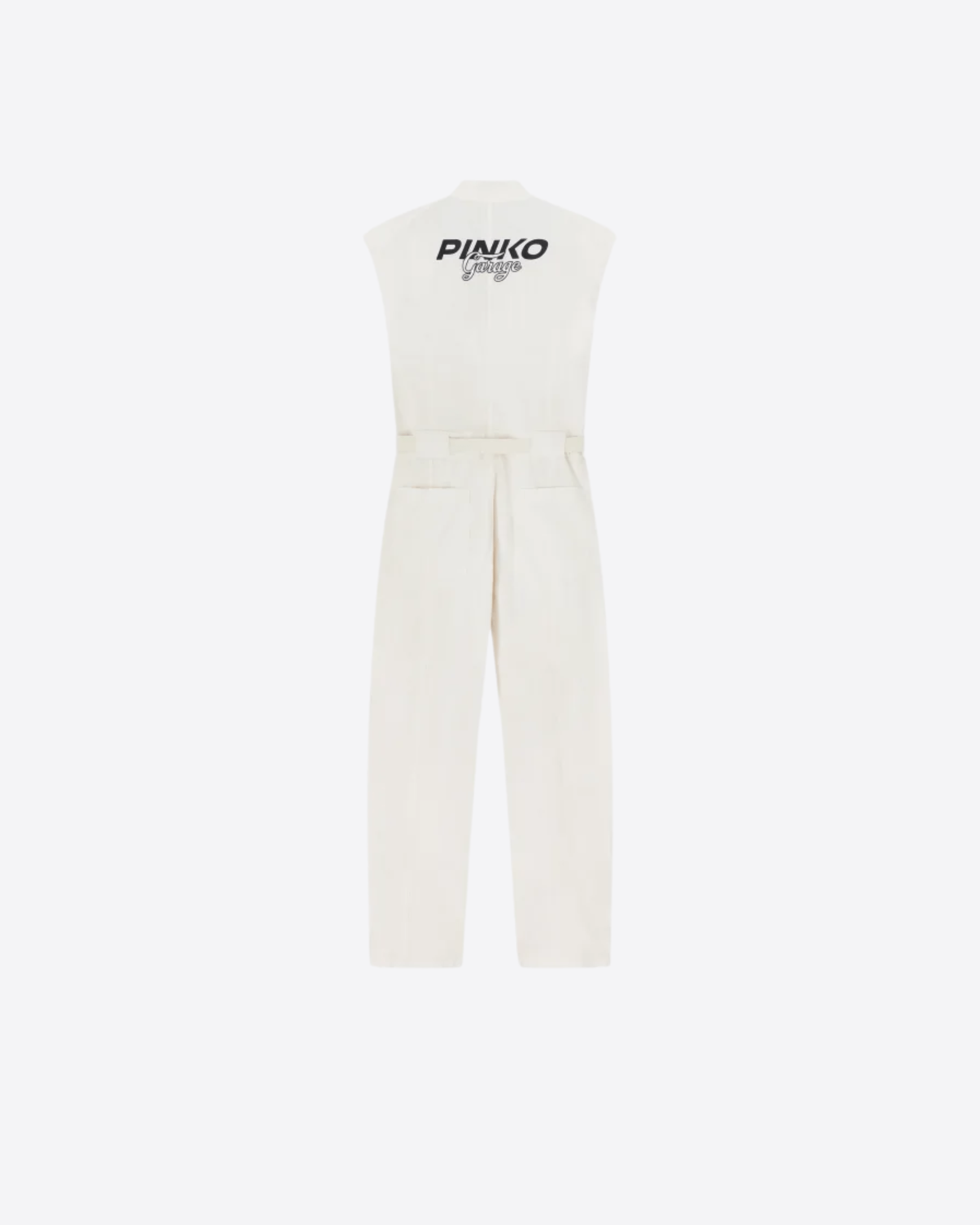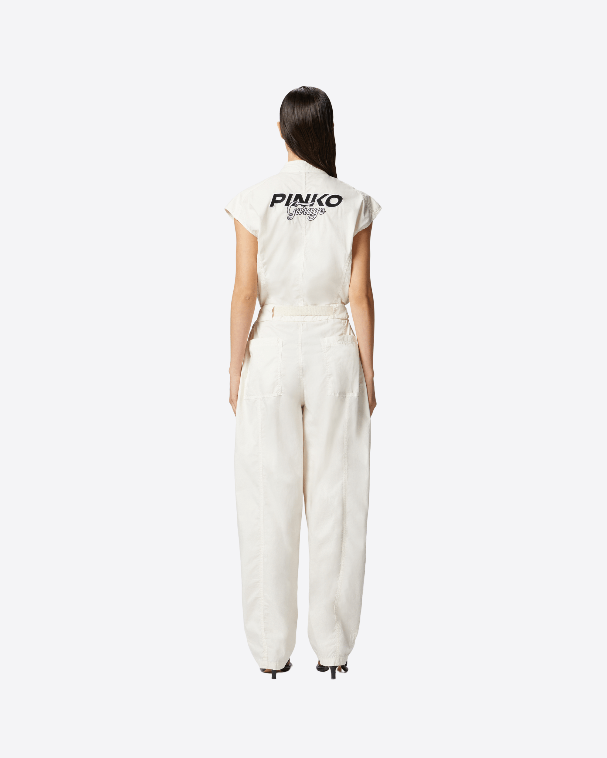 Tuta intera senza maniche dalla vestibilità comoda con pantaloni lunghi realizzata in prezioso cotone pelleovo tinto in capo, un tessuto dalla trama compatta e allo stesso tempo molto leggero e morbido. La parte superiore, dalla linea smanicata, è caratterizzata da colletto in piedi, chiuso con bottone in metallo, e taschini applicati chiusi con zip obliqua. Lo sprone sul retro è personalizzato con logo PINKO Garage bicolore, che ne costituisce il dettaglio identificativo. I pantaloni carrot-fit, più ampi e arrotondati nella parte superiore e più stretti a fondo gamba, sono completati da cintura abbinata in nastro, regolabile con fibbia metallica, per stringere il volume nel punto vita. La tuta intera è chiusa con zip che va dal collo alla patta, ed è un total look casual d'effetto, che combina stile workwear con una femminilità particolare. Indossala anche con un paio di scarpe con il tacco per valorizzare maggiormente il tuo stile.