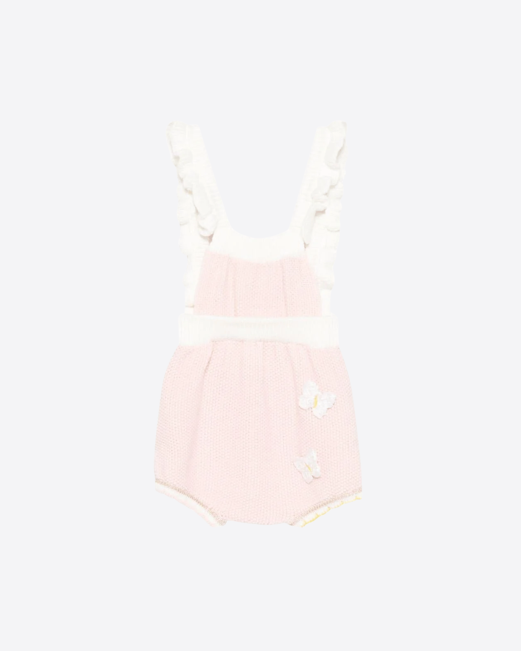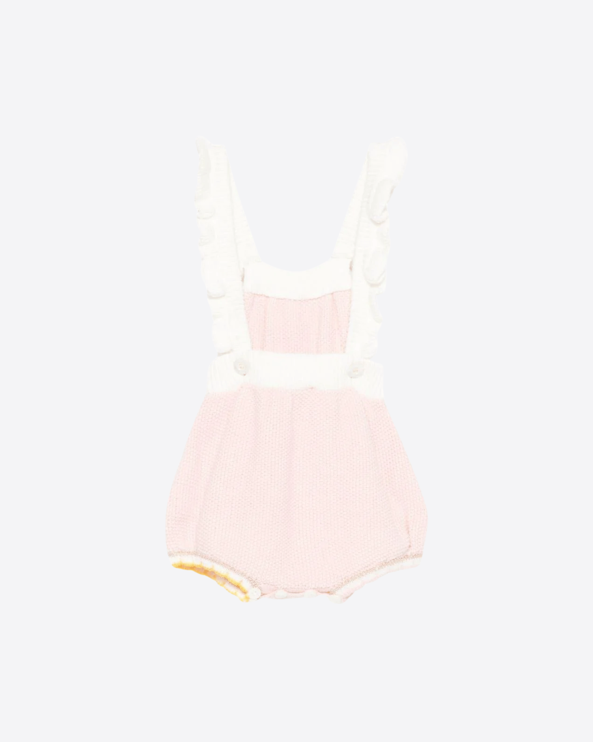 Dolce e curata nei dettagli, la tutina Gensami è perfetta per vestire le più piccole con comfort e stile. Realizzata nei toni del rosa e bianco, si distingue per le bretelle con ruches che aggiungono un tocco delicato e romantico.