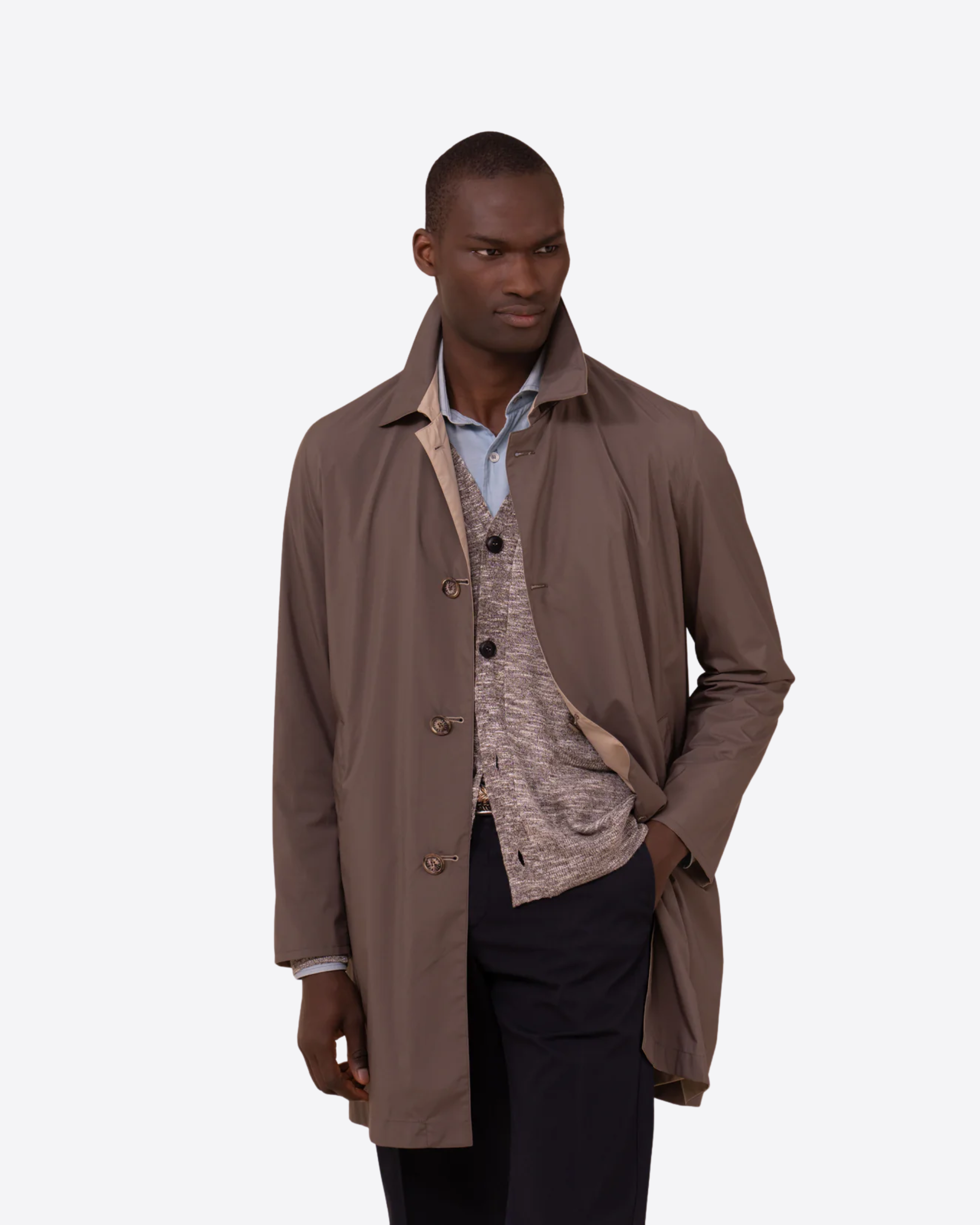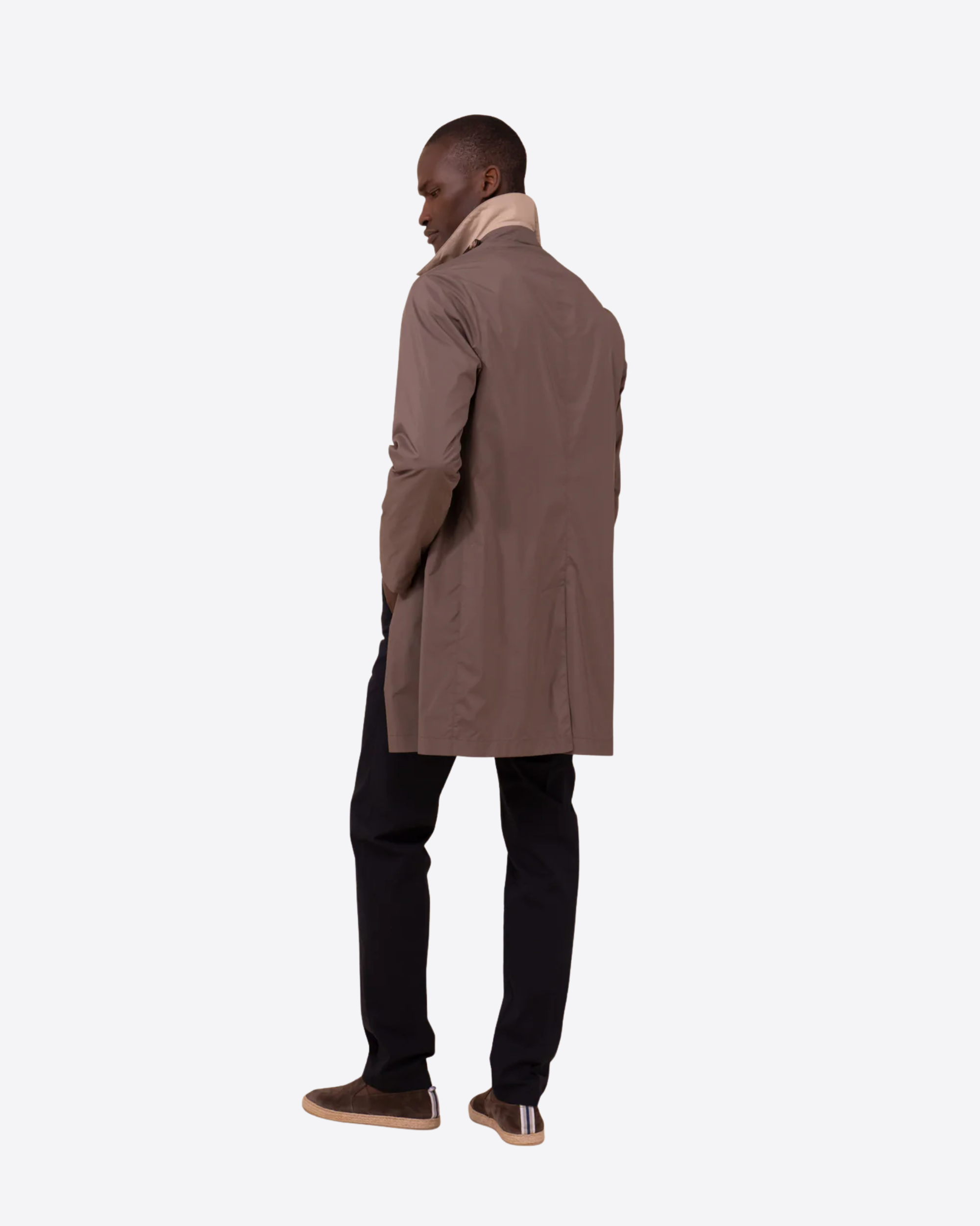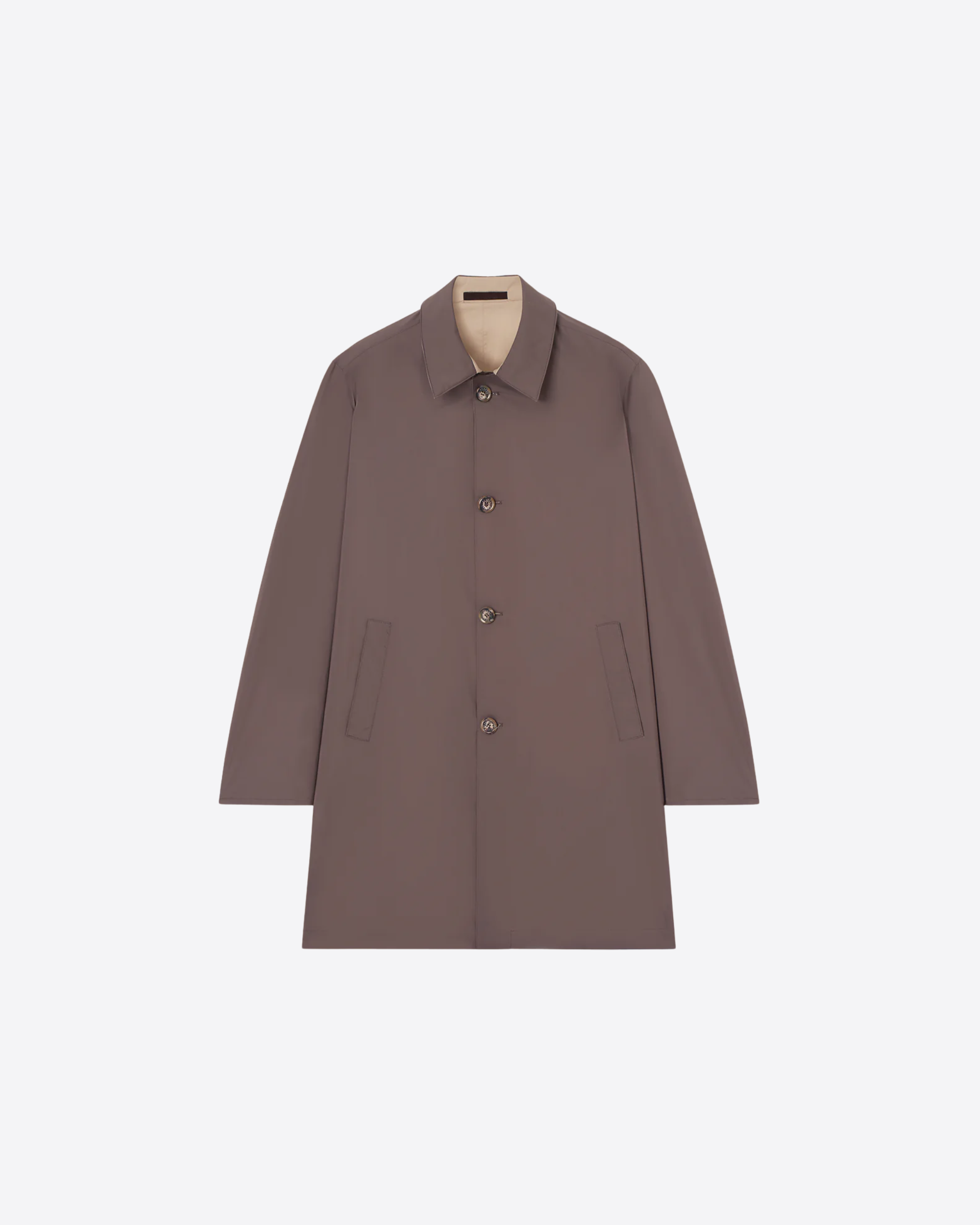 Il design reversibile ne amplifica la funzionalità, permettendo di interpretare lo stile in modo dinamico con due look distinti in un unico capo. La silhouette lineare e dritta dona un aspetto pulito e contemporaneo, valorizzato da bottoni in resina e da discrete tasche laterali a filetto che completano il modello con sobrietà.